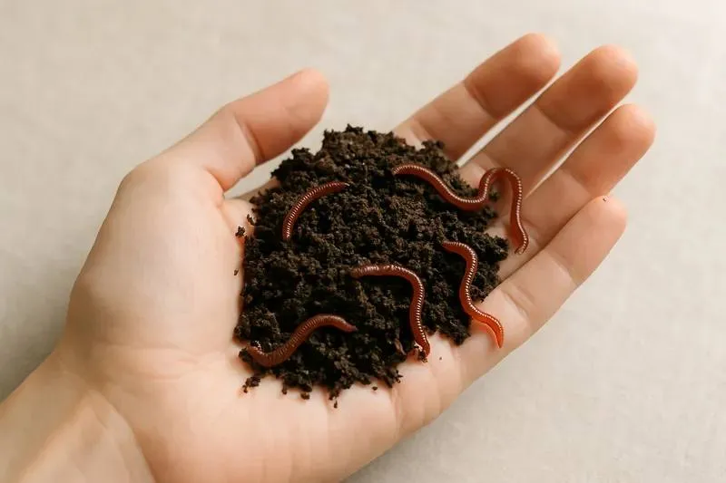 Открытая ладонь человека держит горсть темного биогумуса с дождевыми червями. Для кого наши продукты